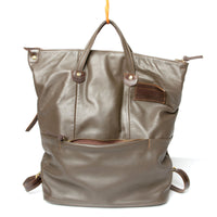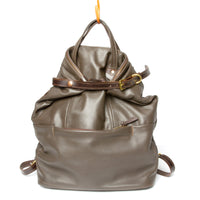 The backpack has a padded exterior, thick leather straps and a zip and buckle closure at the top. With the buckle unfastened it can be used with the top handles like a tote. Internally there is one zipped pocket and pouches for your phone and business cards. Externally there is one front facing zipped pocket.