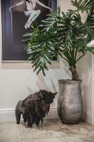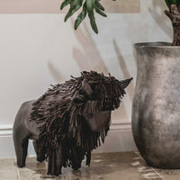 Decorate and elevate any space with our menagerie of leather animals. The standard sized buffalo, featuring a leather fringed mane, with plain brown leather collar, is a great home accessory, and can even be used as a door stop or low footstool.
