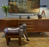 The Large leather elephant is a statement piece, with lovely big ears and ivory leather tusks. It is too tall to be used as a footstool with the height to the top of the back at approximately 55cms. Wire is sewn into the edges of the ears to provide support and keep them flapping.